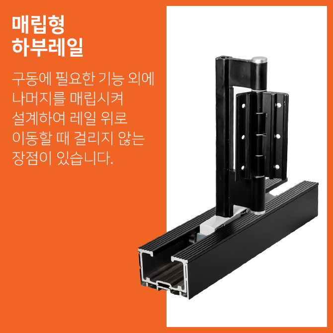 타사대비 한층 두꺼운 고강도 알루미늄 프로파일 바 사용으로 하중 지지 및 내구성 강화는 물론 열전도율을 낮춰 단열성을 높이고 방음, 방풍 효과를 높이는데 도움을 줍니다. 다양한 종류의 하부 레일을 사용 환경에 따라 선택할 수 있습니다